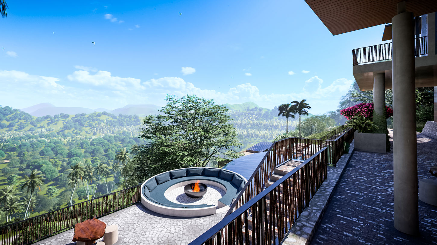 At the heart of the resort is a semi circle infinity pool that stretches toward the expansive view adjacent to a circular conversation pit with fire feature for ceremonial gatherings. A coconut-lined driveway marks the arrival experience, while subtle lighting and the neighbouring river enhance the overall sense of tranquility. The resort was designed to offer an immersive and restorative escape.