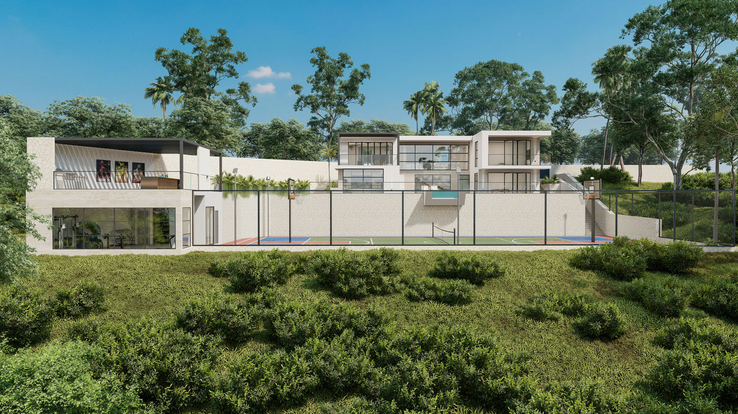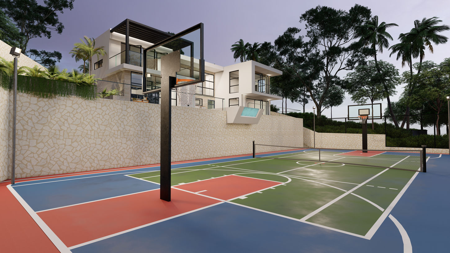 This resort-style compound is thoughtfully designed to blend into its hillside location, seamlessly integrating with the natural contours to become an extension of the hill itself. Set on a steep and challenging site, the compound features a three-bedroom villa positioned above a multipurpose court, running track, recording studio, gymnasium, sauna, and outdoor dining and entertainment spaces, all strategically oriented to capture the expansive sea views.